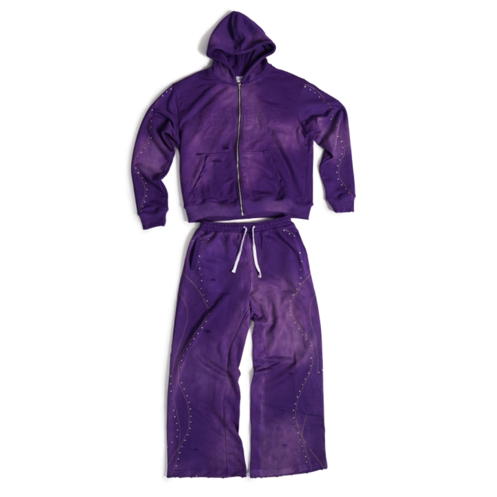 The Nocturnal Sweatsuit Set in Purple is built for the nights when the world feels soft and your mind finally slows down. The hoodie and sweatpants share a deep violet acid wash, flowing stitch lines, and hand-placed rhinestones that shimmer like distant city lights. Raised SERENE branding adds a textured identity while the subtle distressing gives the full set a lived-in authenticity. Warm, oversized, and intentionally expressive, this set captures what SereneMade stands for — calm in the chaos, clarity in the dark, and style that tells its own story.
